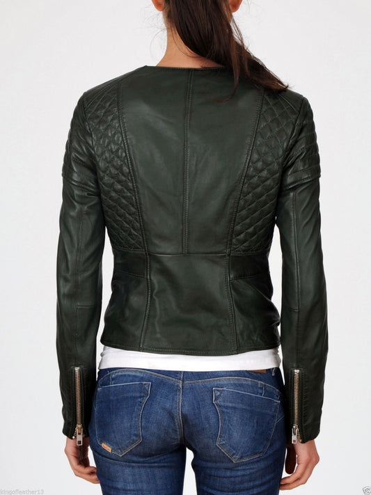 Women’s Quilted Leather Jacket with Round Neck WJ033