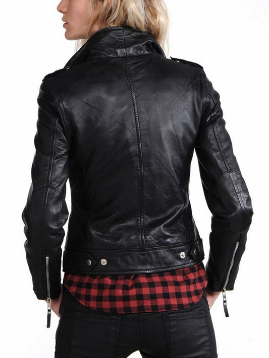 Women's Genuine Leather Motorcycle Jacket Black WJ006
