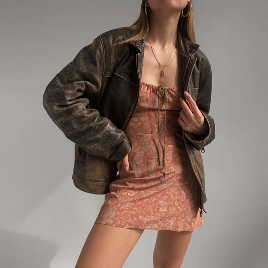 Women's Vintage Oversized Distressed Brown Leather Jacket WD08