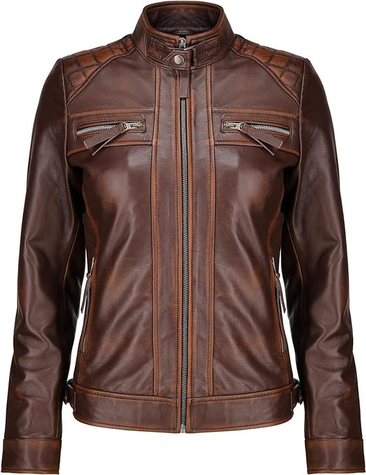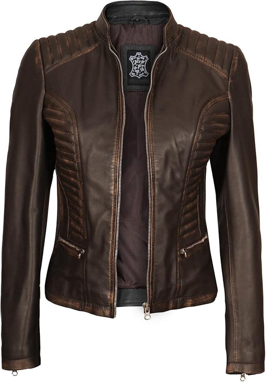 Women's Vintage Quilted Distressed Brown Leather Jacket WD05