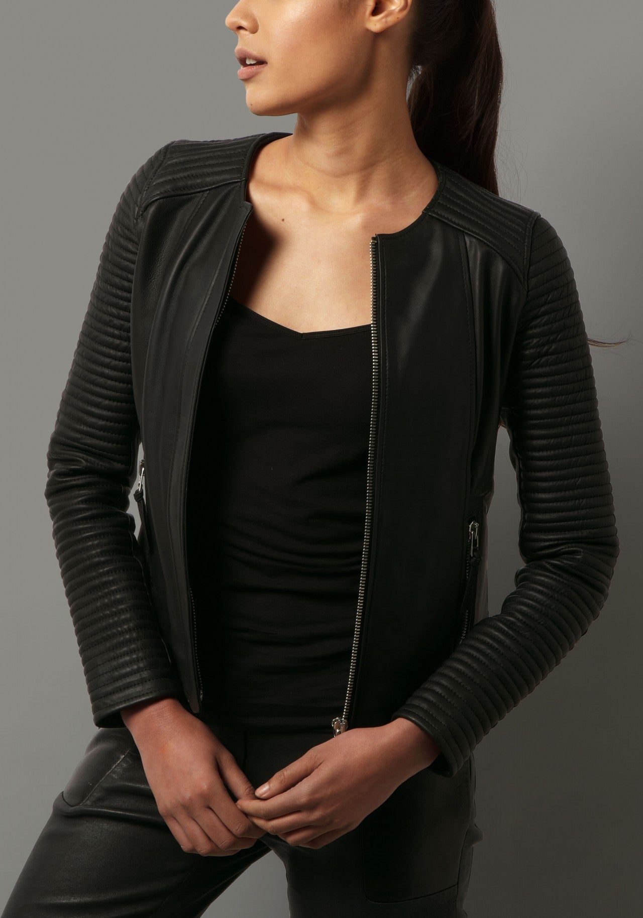 Women’s Quilted Leather Jacket with Round Neck WJ026