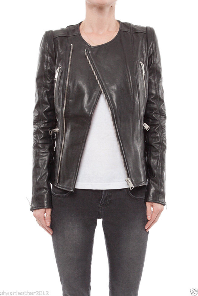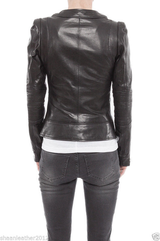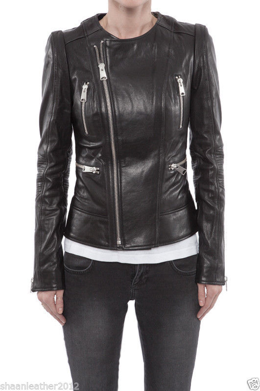 Women's Round Neck Black Leather Jacket WJ045