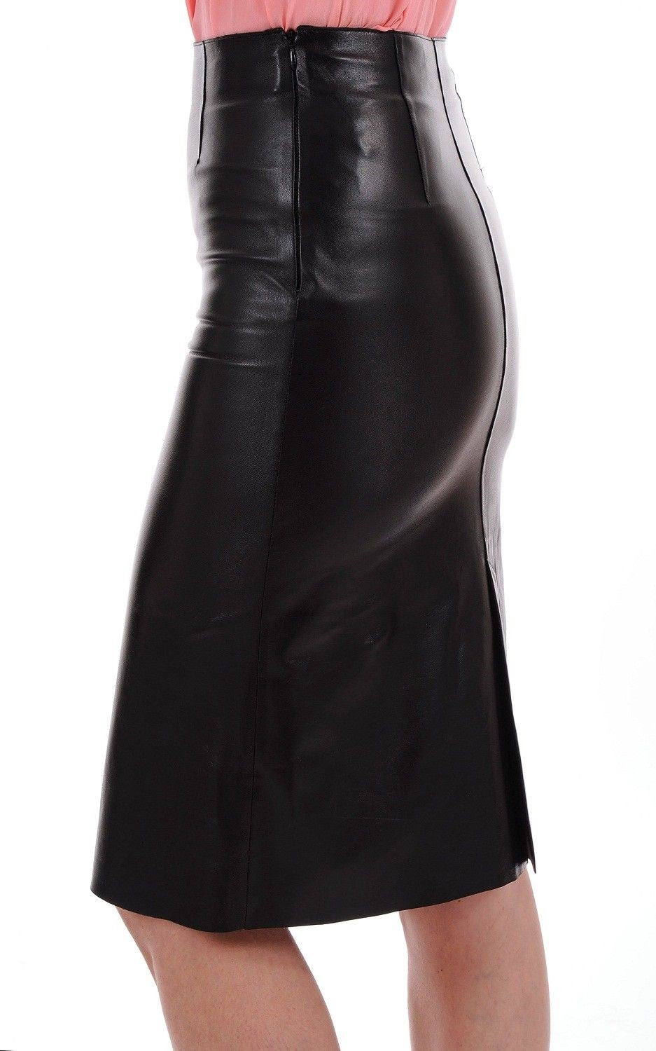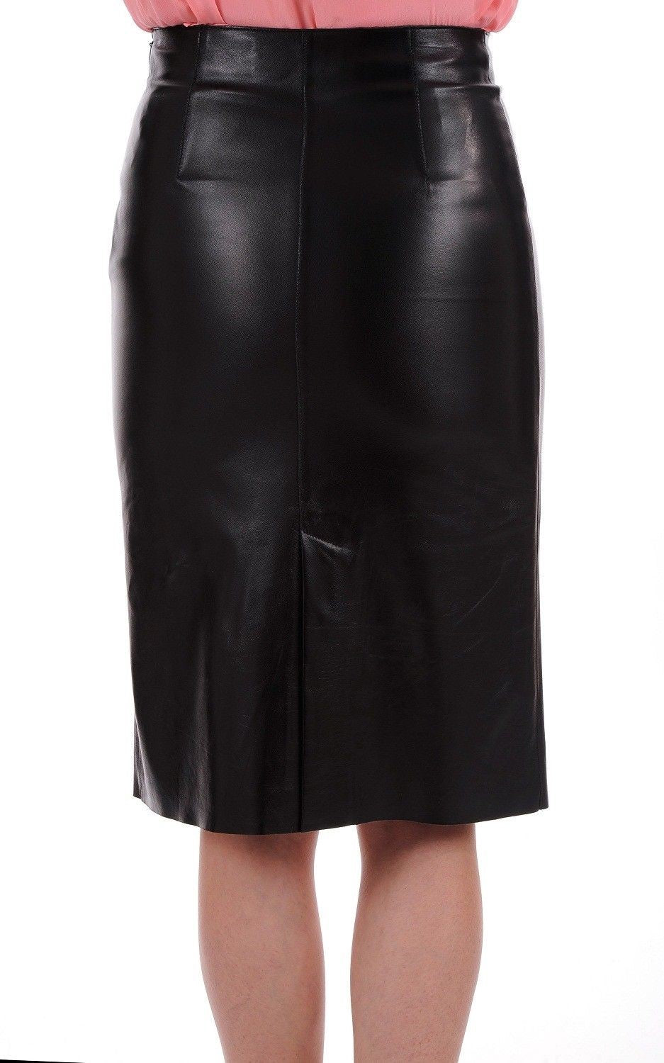 Embrace timeless elegance with this knee length black leather pencil skirt, featuring a sleek side zipper closure for a modern touch. The classic silhouette is complemented by a luxurious satin lining, ensuring comfort and a polished look. Crafted from genuine leather, this skirt is an essential piece for any fashion-forward wardrobe, seamlessly transitioning from office sophistication to evening allure.