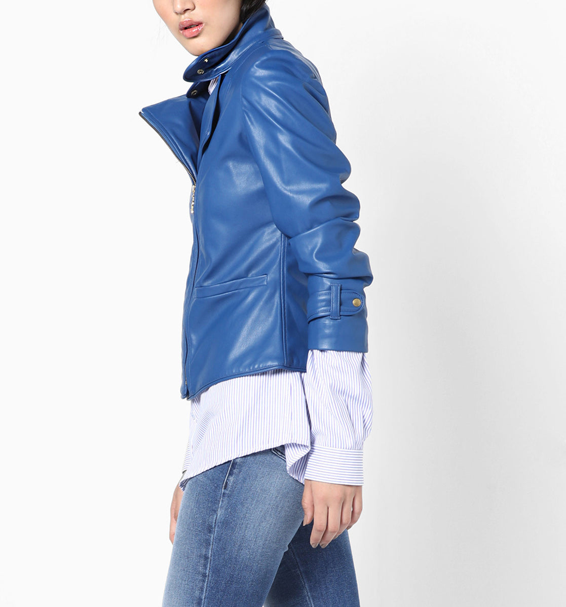 Add a bold touch to your wardrobe with this women’s stylish blue leather jacket from Leather Safari. Crafted from genuine leather, this jacket stands out with its vibrant blue hue and sleek design. The zipper closure offers a streamlined fit, while the snap button collar adds a distinctive edge. Inside, the satin lining provides a smooth, comfortable wear, making this jacket as practical as it is eye catching. Whether paired with jeans for a casual look or layered over a dress for a night out, this jacket brings effortless style to any outfit.