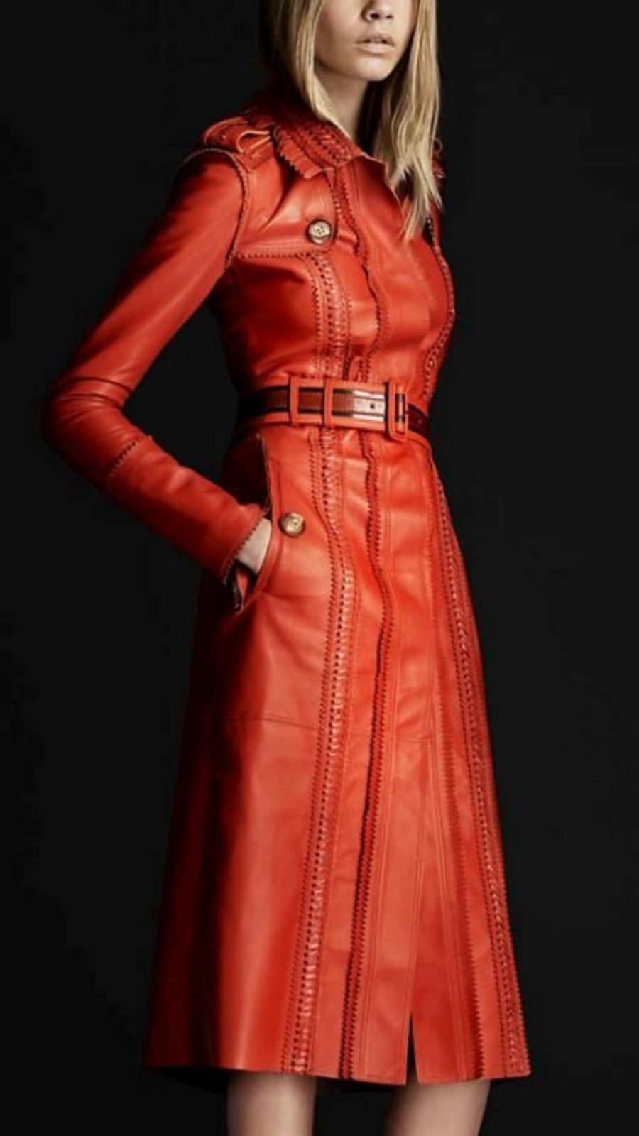 Women's Vibrant Orange Knee Length Leather Trench Coat TC25